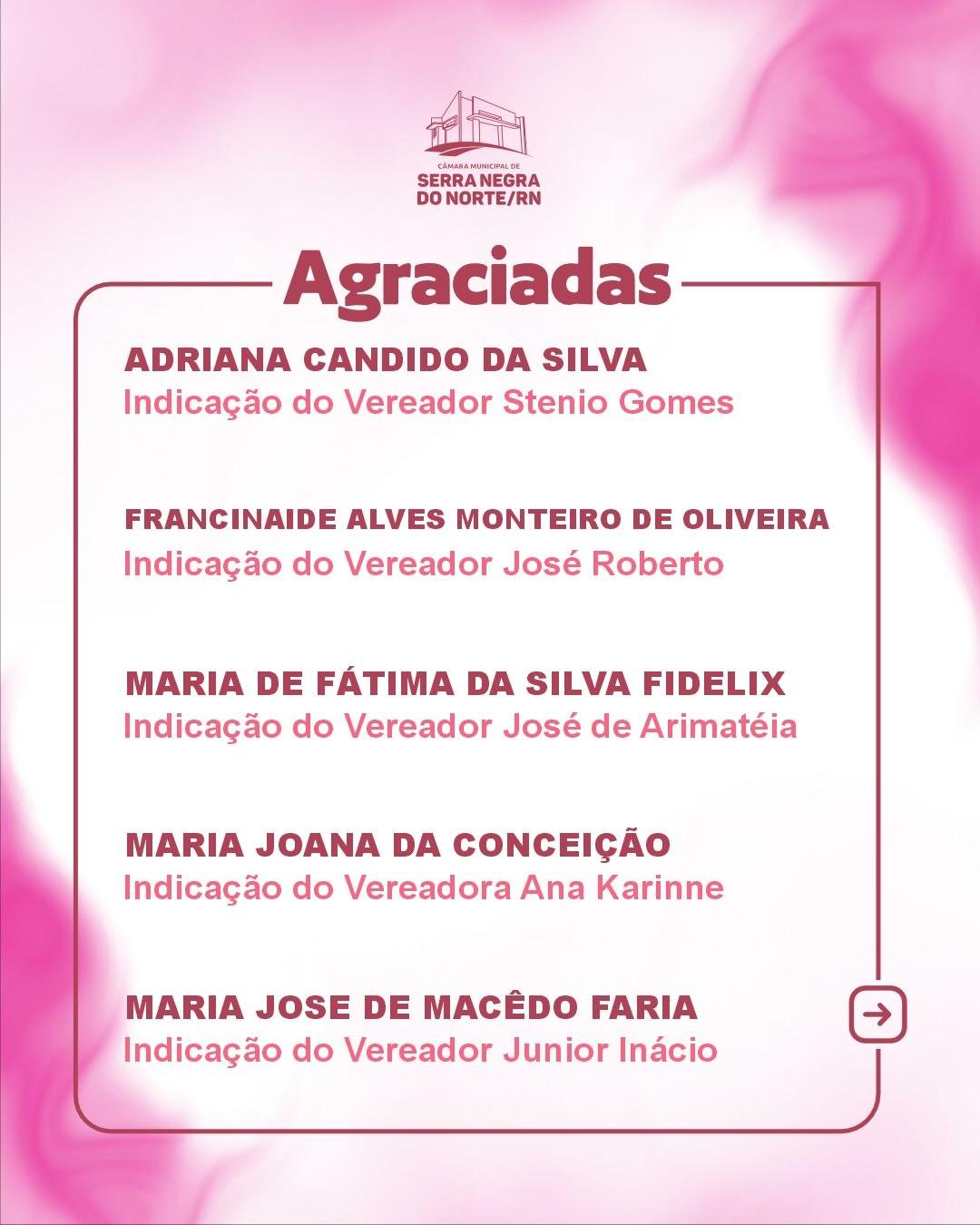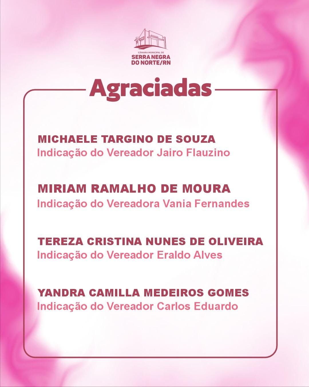 Cada homenageada foi indicada pelos vereadores como forma de valorizar mulheres que fazem a diferença em suas famílias, em suas comunidades e em toda Serra Negra do Norte.
